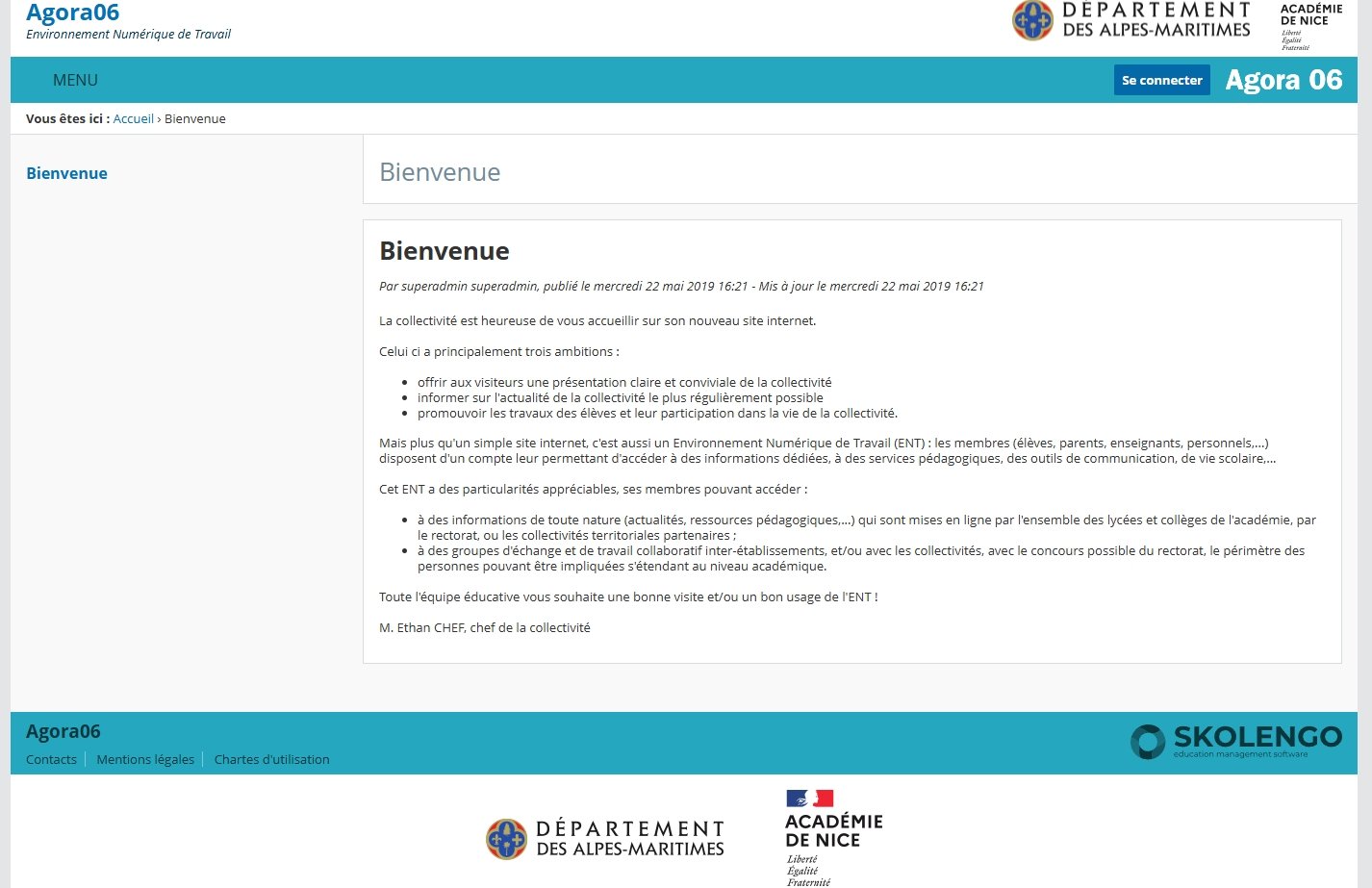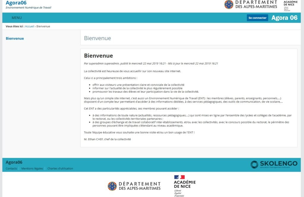 Concrètement, Agora06 est l’Espace numérique de travail (ENT) officiel déployé pour tous les collèges des Alpes-Maritimes. C’est un portail web entièrement sécurisé, mis en place conjointement par le Département et l’Académie de Nice.